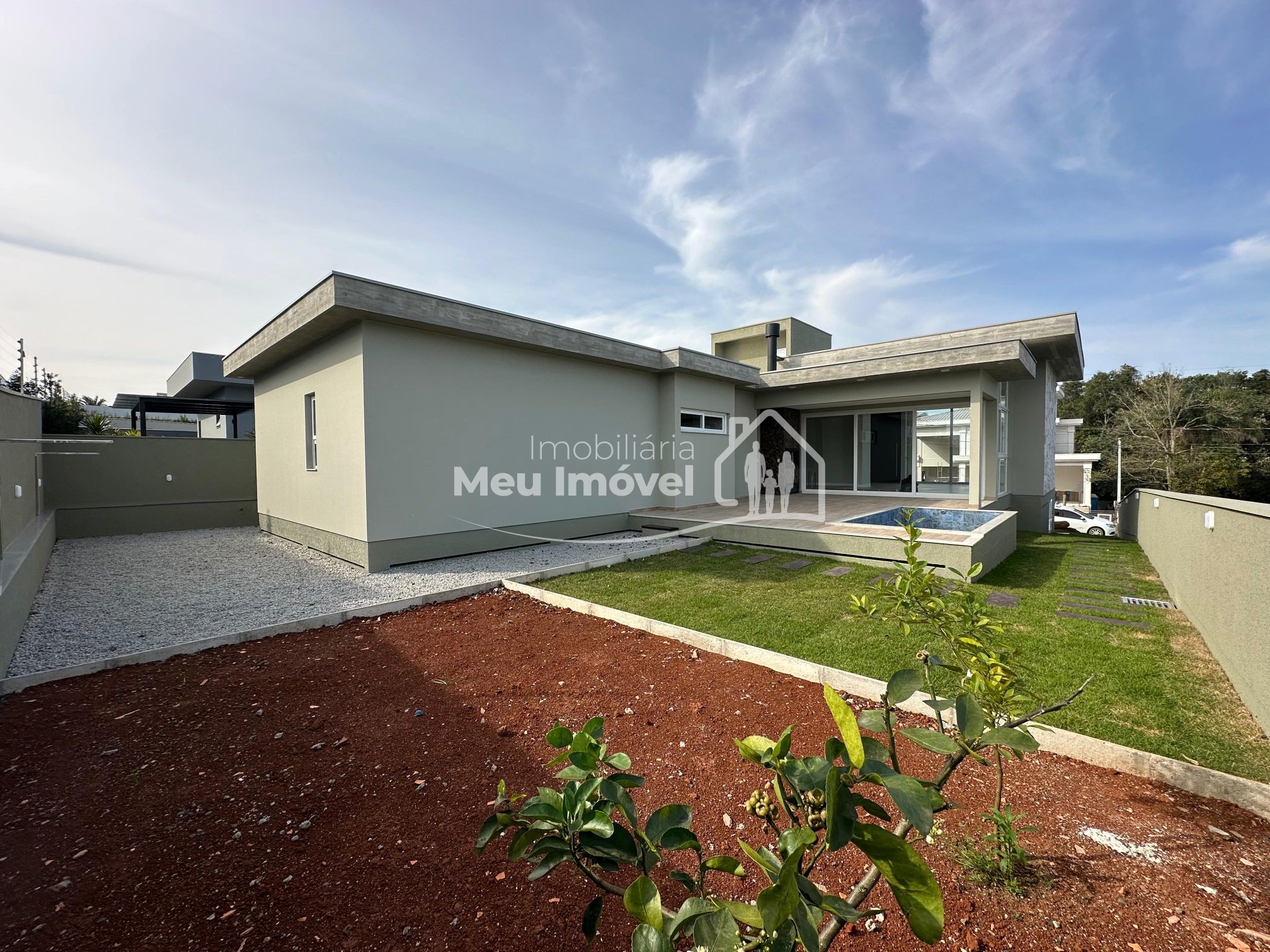 Já o terreno possuí boa localização perante ao condomínio, acima do nível da rua e com frente para o sol nascente, para uma melhor ventilação e ótima incidência solar. Foram feitos a calçada e rampa de acesso para garagem com paver, caixa de brita ao entorno da casa, espaço varal, horta, jardinagem, muro com iluminação e pingadeiras, passarelas e sistema de drenagem. Com área de 588,20m² e as seguintes confrontações: