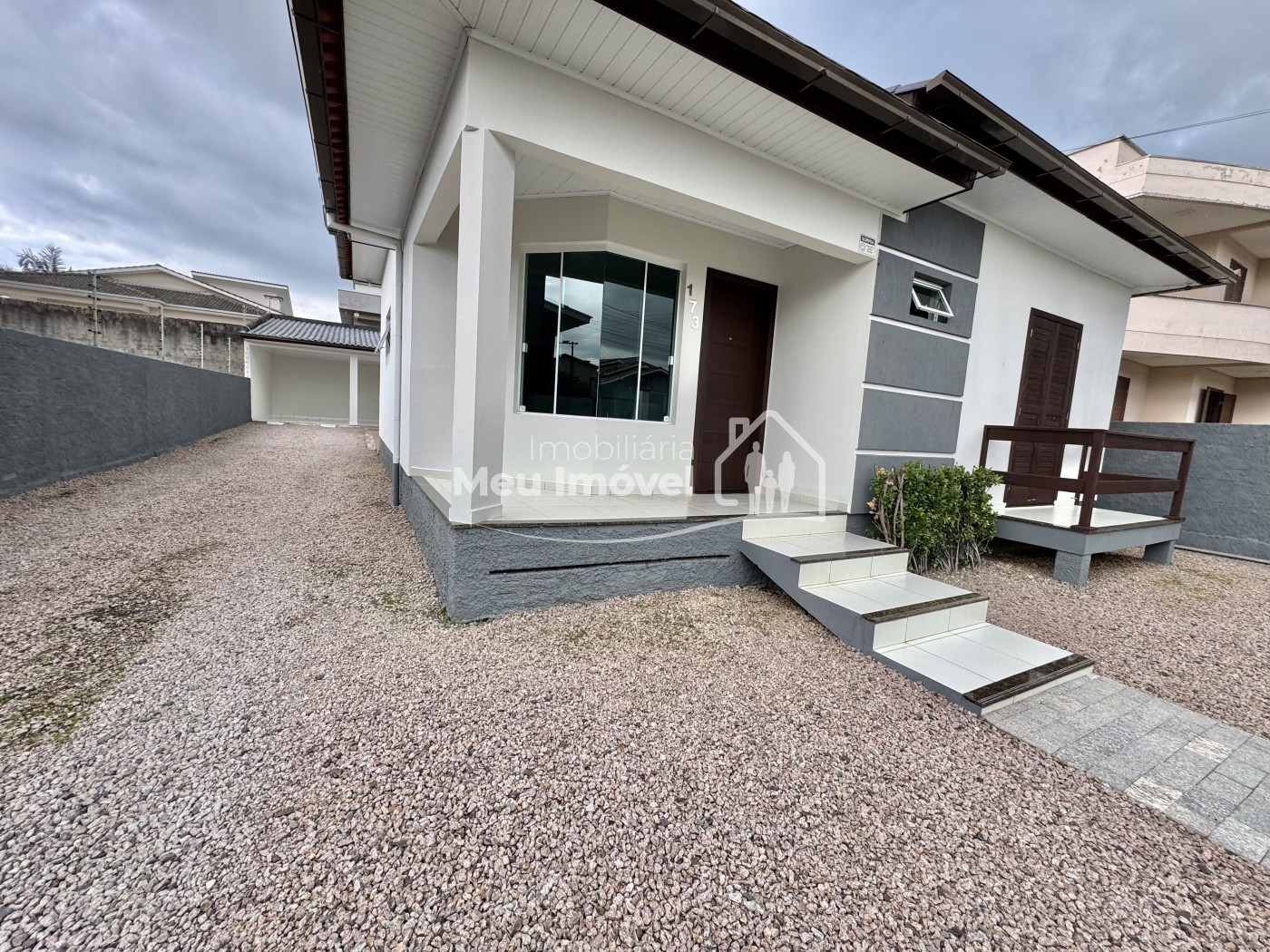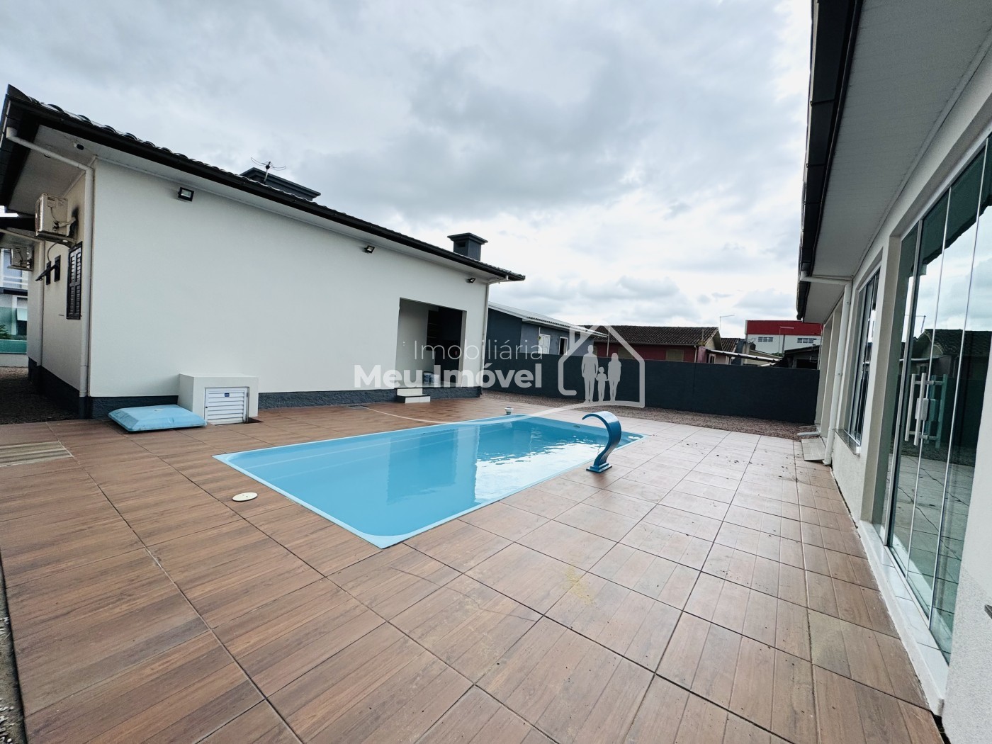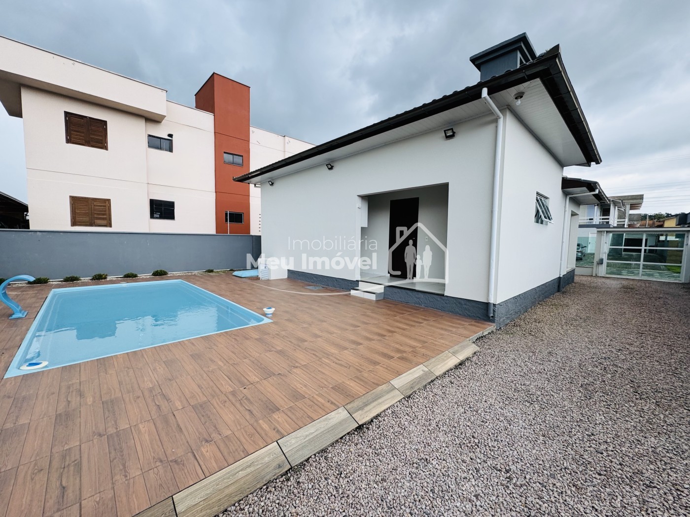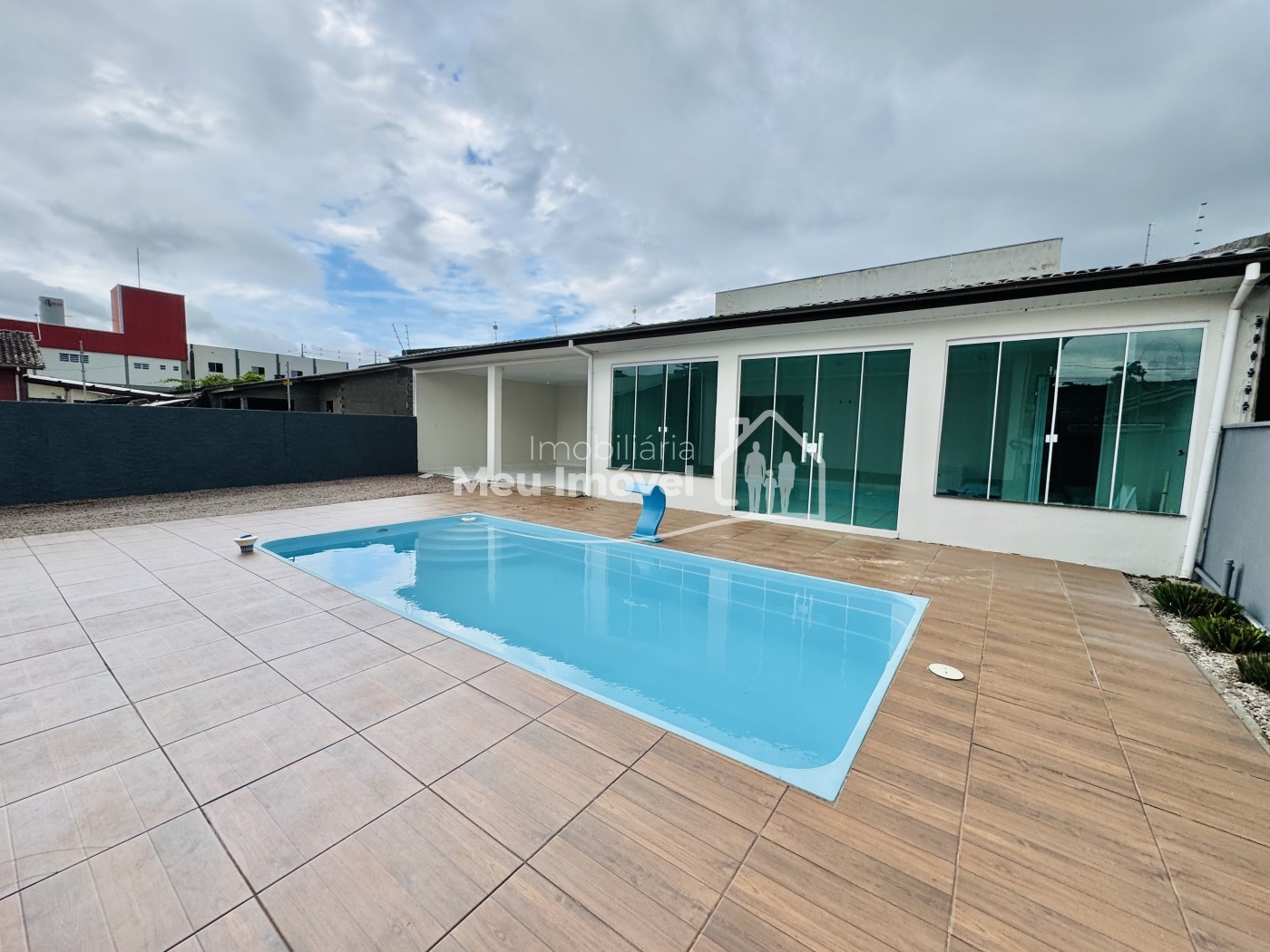 – Casa 82 m² + salão de festas e garagem 66 m² + área da piscina 81 m²