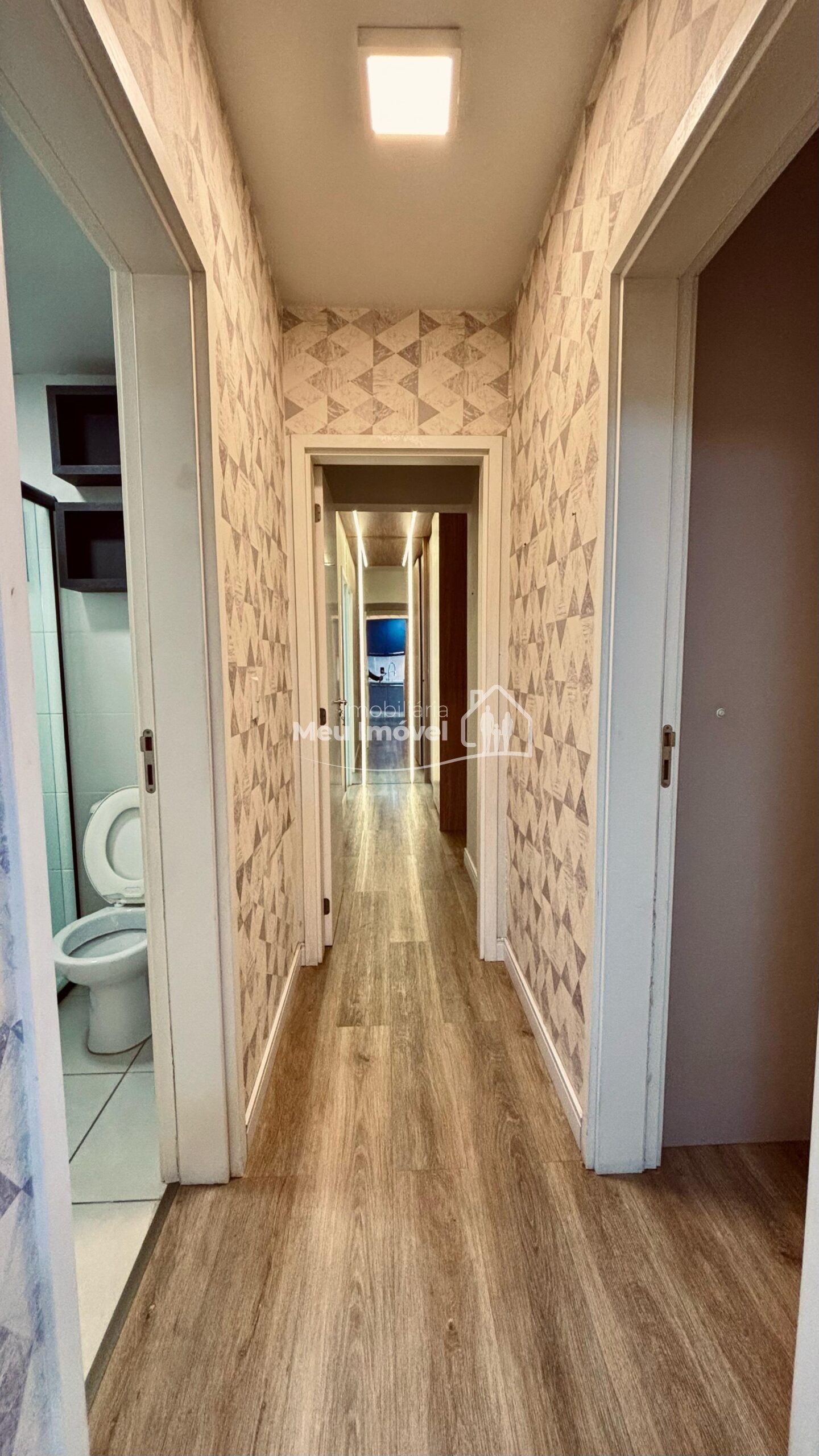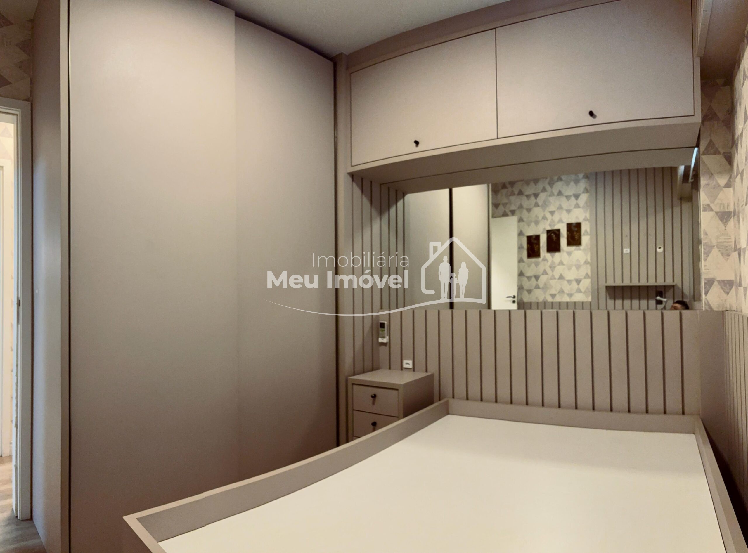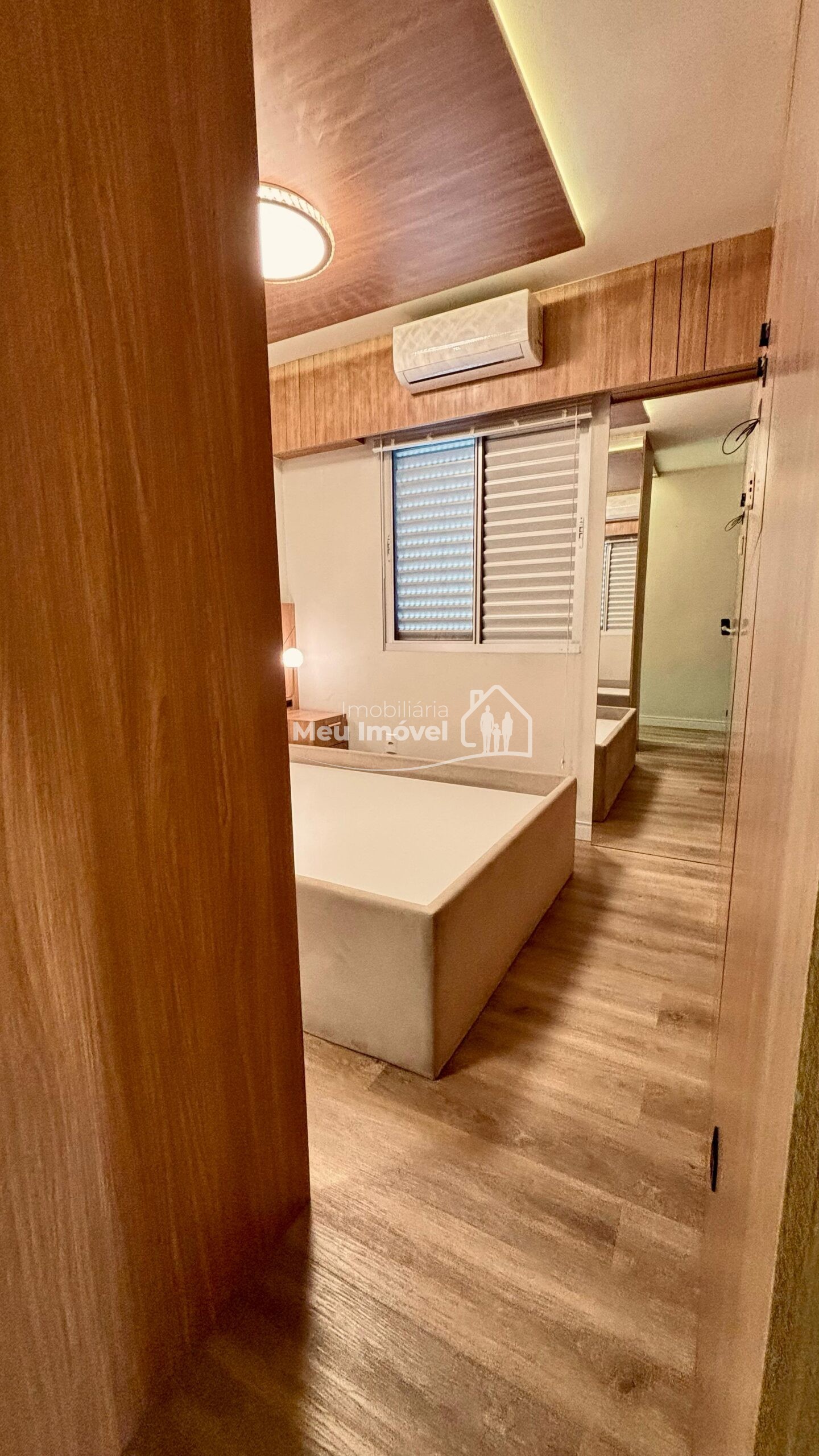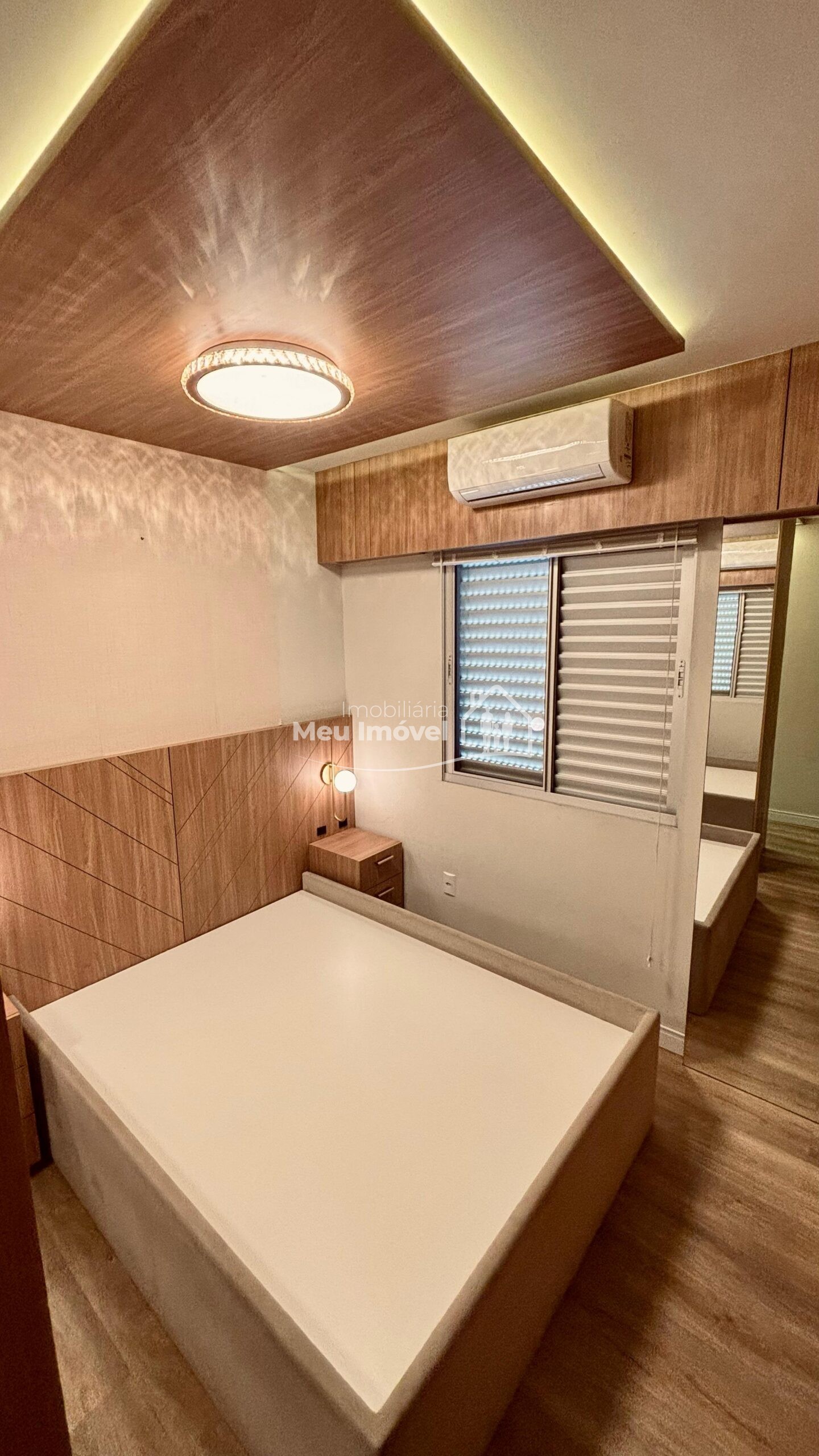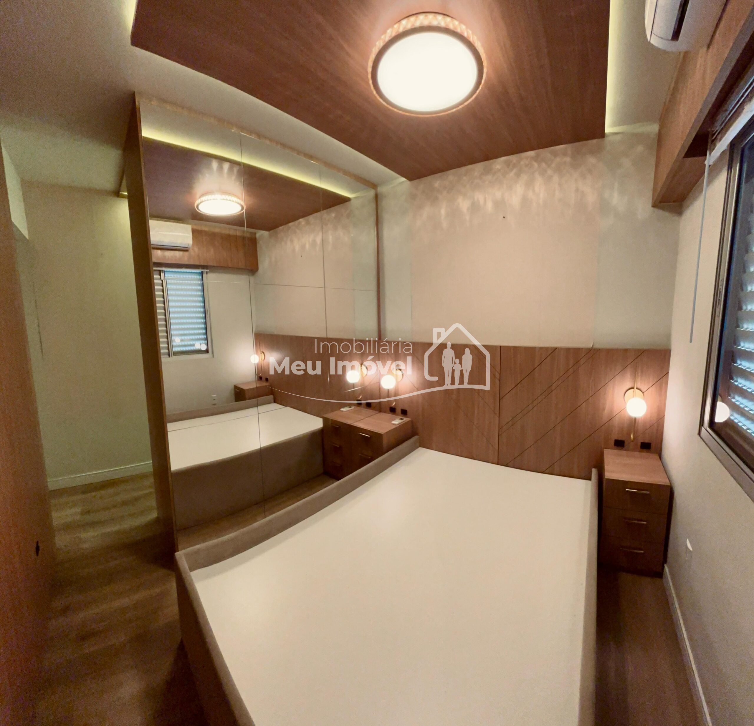 Dois dormitorios com suite, banheiro social, sala de estar/jantar, sacada e uma vaga de garagem.